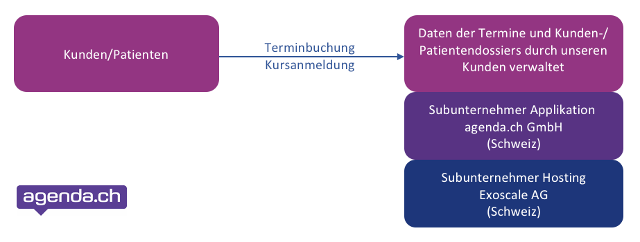 2. Der Subunternehmer (Data Processor) - (hier agenda.ch) ist die Firma, die die personenbezogenen Daten im Auftrag des für die Verarbeitung Verantwortlichen "verarbeitet".