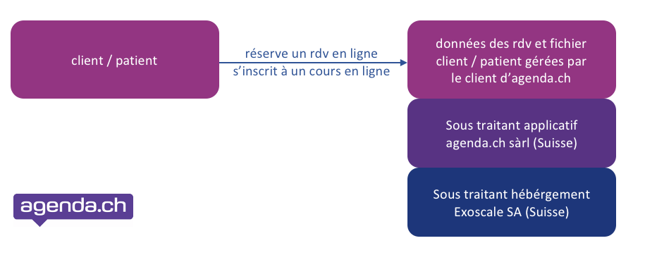 - agenda.ch n'utilise et ne traite pas les données de ses clients, en particulier leur fichier patient ou client.